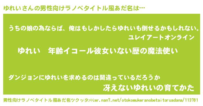 | 女子向けラノベタイトル風あだ名 | 『ゆれいの玉の輿計画!』 |