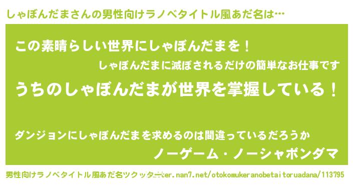 | 胡散臭い通販商品みたいなあだ名 | 『あなたにだけ特別に提供する限定10本のレアな日本酒…その名も「しゃぼんだま」』 |