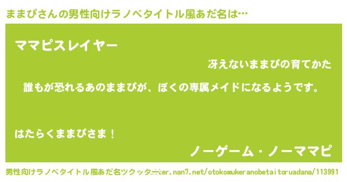 | 女子向けラノベタイトル風あだ名 | 『ままぴの契約王妃』『死神ままぴの再婚』 |