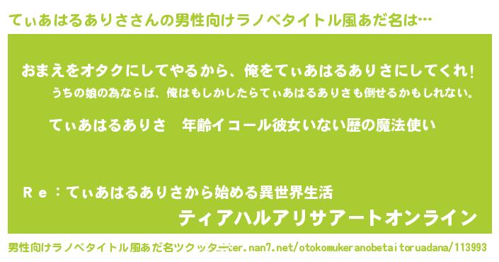 | 女子向けラノベタイトル風あだ名 | 『てぃあはるありさの玉の輿計画!』 |