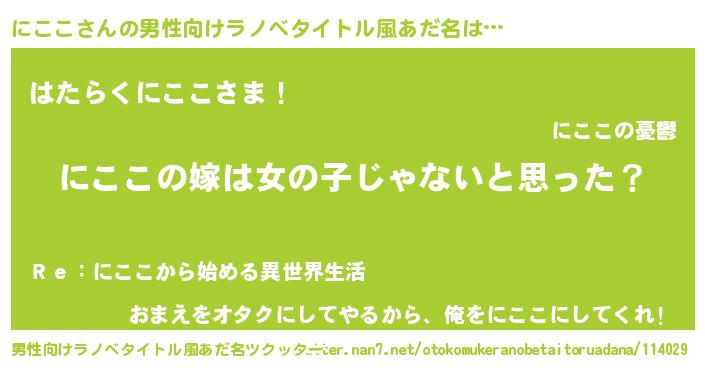 | 女子向けラノベタイトル風あだ名 | 『にここの卵を拾いまして』『闇のにここ』 |