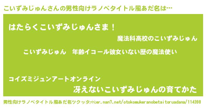 | 女子向けラノベタイトル風あだ名 | 『こいずみじゅんの玉の輿計画!』 |