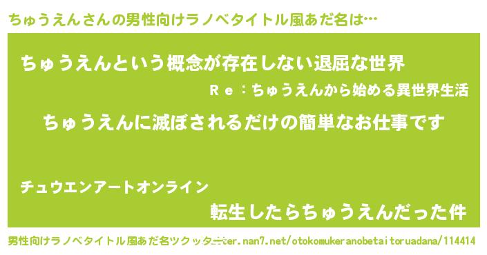 | 胡散臭い通販商品みたいなあだ名 | 『来世でも幸せになれる健康食品…その名も「ちゅうえん」』 |