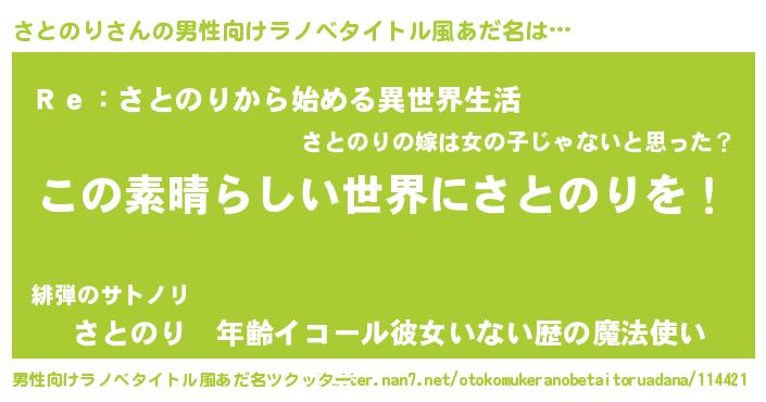 | 女子向けラノベタイトル風あだ名 | 『乙女ゲームの破滅フラグしかない悪役さとのりに転生してしまった…』 |