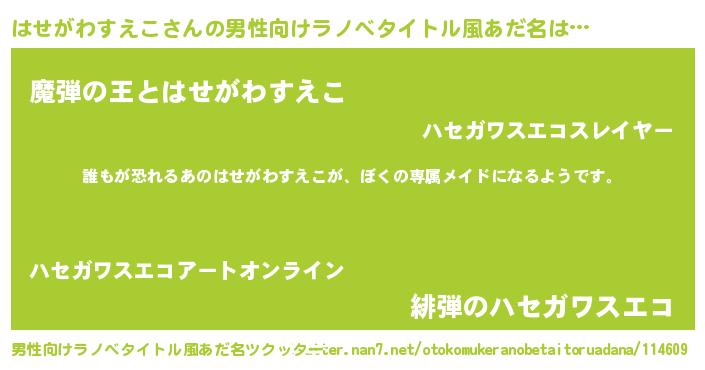 | 女子向けラノベタイトル風あだ名 | 『はせがわすえこの契約王妃』 |