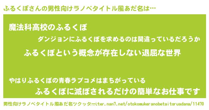 | 女子向けラノベタイトル風あだ名 | 『異世界で失敗しない100のふるくぼ』 |