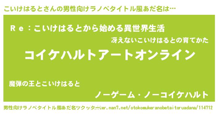 | 女子向けラノベタイトル風あだ名 | 『誰かこのこいけはるとを説明してください! ~契約から始まるウェディング~』 |