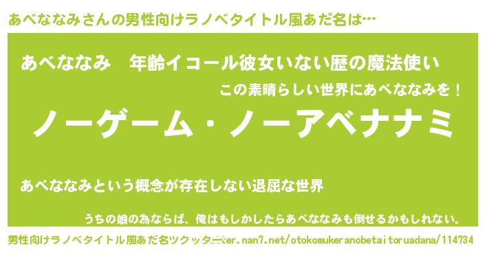 | 女子向けラノベタイトル風あだ名 | 『死神あべななみの再婚』 |
