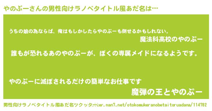 | 胡散臭い通販商品みたいなあだ名 | 『来世でも幸せになれる健康食品…その名も「やのぷー」』 |