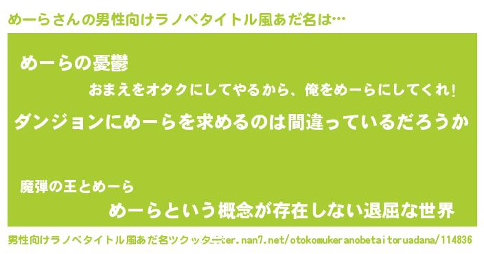 | 女子向けラノベタイトル風あだ名 | 『めーらの卵を拾いまして』 |