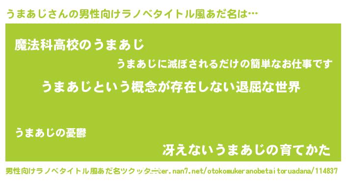 | 女子向けラノベタイトル風あだ名 | 『異世界で失敗しない100のうまあじ』 |