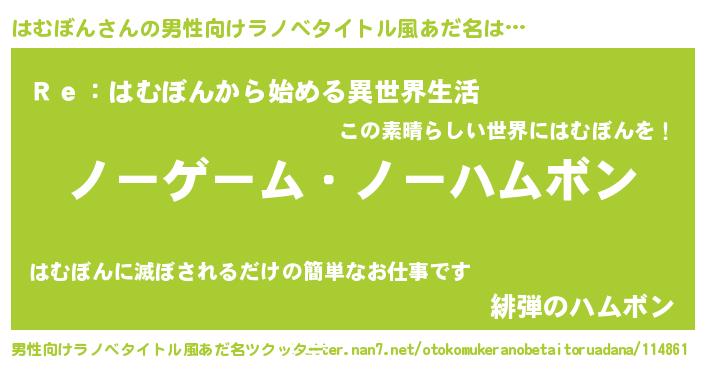| 女子向けラノベタイトル風あだ名 | 『死神はむぼんの再婚』『闇のはむぼん』 |