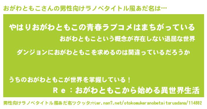 | 女子向けラノベタイトル風あだ名 | 『おがわともこの卵を拾いまして』 |