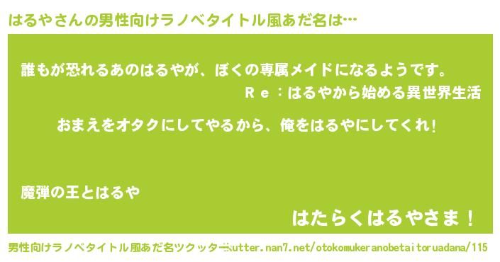 | 女子向けラノベタイトル風あだ名 | 『はるや夫妻のなれそめ』『闇のはるや』 |