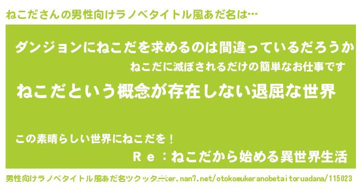 | 女子向けラノベタイトル風あだ名 | 『ねこだの契約王妃』『闇のねこだ』 |