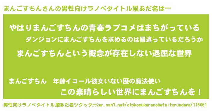 | 女子向けラノベタイトル風あだ名 | 『異世界で失敗しない100のまんごすちん』 |