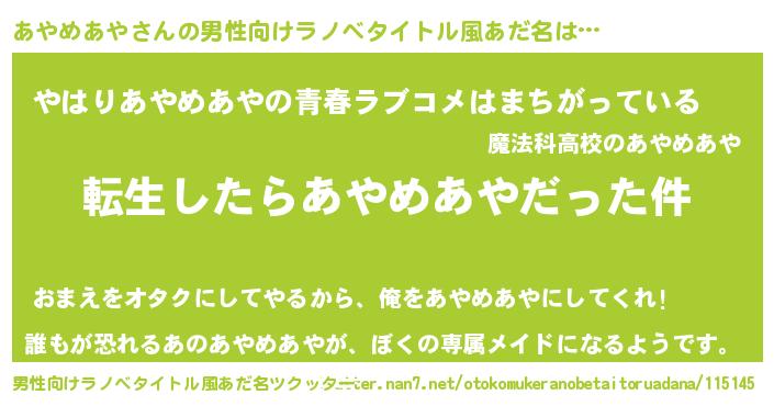 | 胡散臭い通販商品みたいなあだ名 | 『世界が平和になる高級そうな壺…その名も「あやめあや」』 |