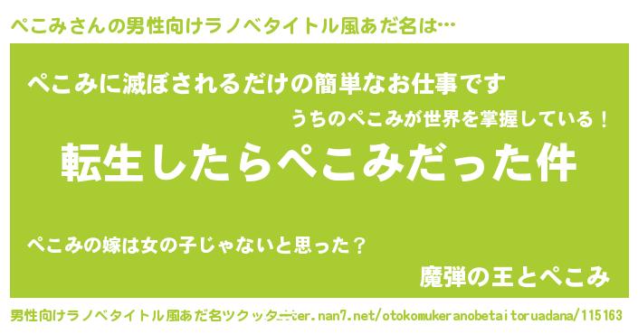 | 胡散臭い通販商品みたいなあだ名 | 『世界中を虜にした100年もののヴィンテージワイン…その名も「ぺこみ」』 |