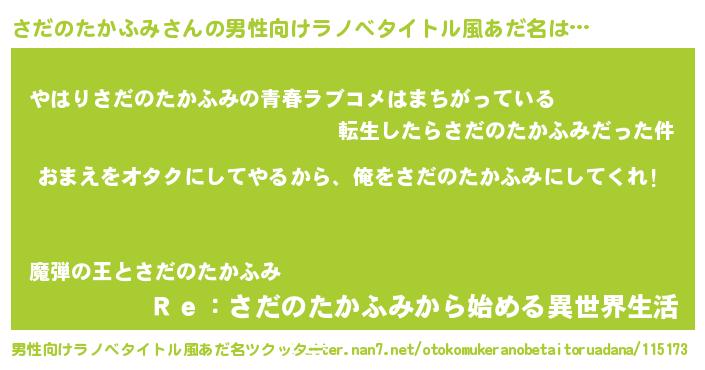| 胡散臭い通販商品みたいなあだ名 | 『100人中100人が認めたイリジウム磁石…その名も「さだのたかふみ」』 |