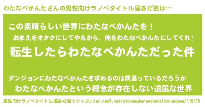 | 女子向けラノベタイトル風あだ名 | 『婚約破棄系悪役わたなべかんたに転生したので、保身に走りました。』 |