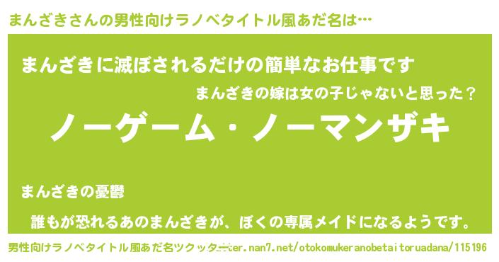 | 女子向けラノベタイトル風あだ名 | 『死神まんざきの再婚』 |