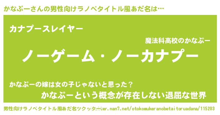 | 女子向けラノベタイトル風あだ名 | 『死神かなぷーの再婚』 |