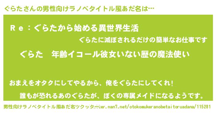 | 女子向けラノベタイトル風あだ名 | 『ぐらたの玉の輿計画!』 |