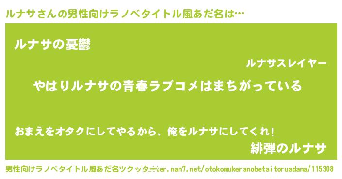 | 女子向けラノベタイトル風あだ名 | 『ルナサの雑貨屋さん』 |