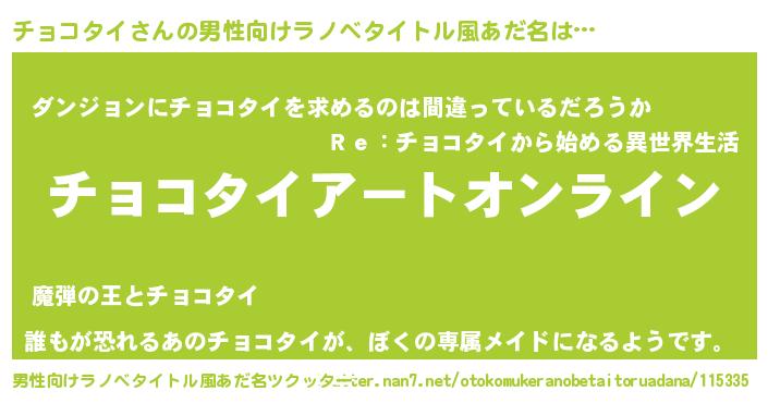 | 胡散臭い通販商品みたいなあだ名 | 『億万長者になれるブレスレット…その名も「チョコタイ」』 |