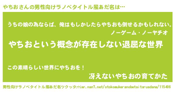 | 女子向けラノベタイトル風あだ名 | 『異世界で失敗しない100のやちお』 |