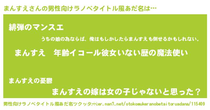 | 女子向けラノベタイトル風あだ名 | 『まんすえの玉の輿計画!』 |