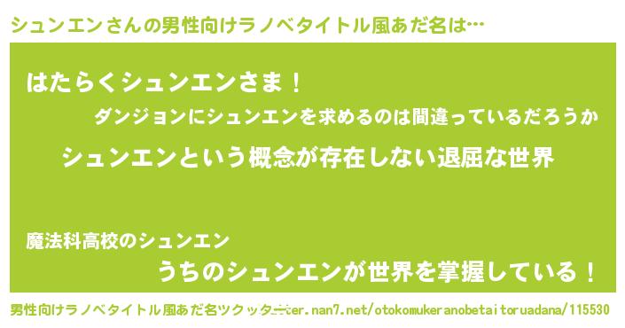 | 女子向けラノベタイトル風あだ名 | 『異世界で失敗しない100のシュンエン』 |