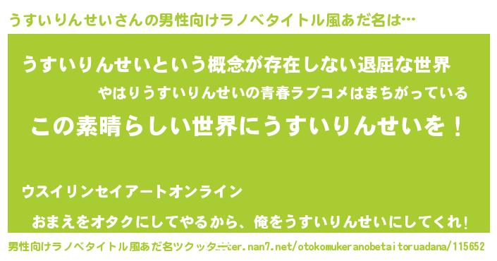 | 胡散臭い通販商品みたいなあだ名 | 『あなたにだけ特別に提供する限定10本のレアな日本酒…その名も「うすいりんせい」』 |