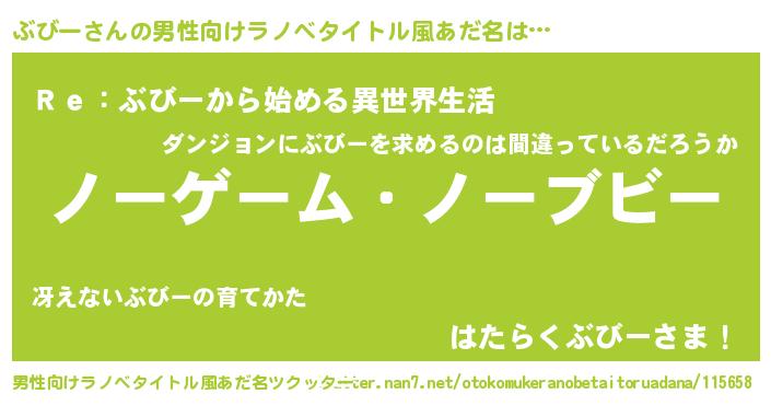 | 女子向けラノベタイトル風あだ名 | 『死神ぶびーの再婚』『闇のぶびー』 |