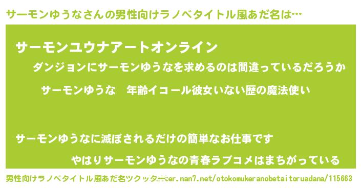 | 女子向けラノベタイトル風あだ名 | 『サーモンゆうなの玉の輿計画!』 |