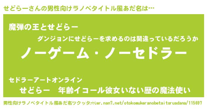 | 女子向けラノベタイトル風あだ名 | 『死神せどらーの再婚』 |