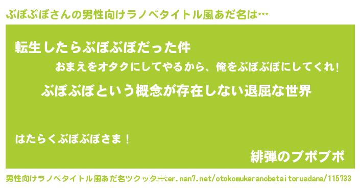| ヘコむあだ名 | 『ぶぼぶぼ(遠い目)』『ぶぼっぺ』 |