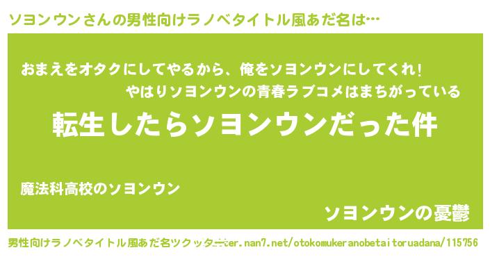 | 女子向けラノベタイトル風あだ名 | 『ソヨンウンの玉の輿計画!』 |