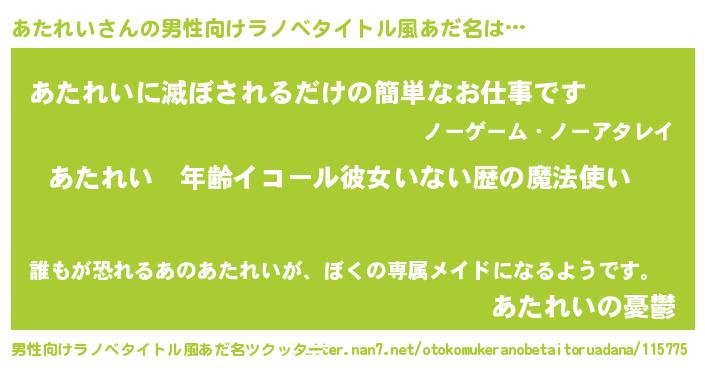 | 女子向けラノベタイトル風あだ名 | 『あたれいの玉の輿計画!』 |
