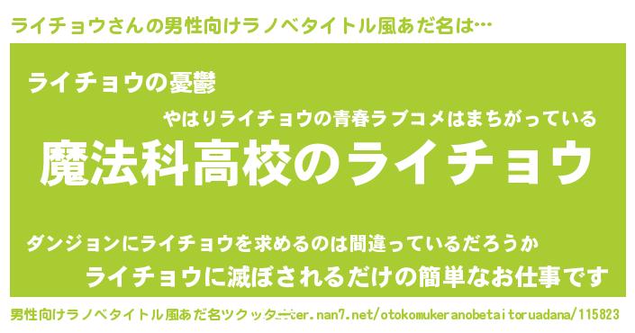 | 女子向けラノベタイトル風あだ名 | 『ライチョウなんてお断りですっ。』 |