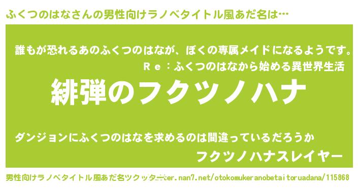 | 胡散臭い通販商品みたいなあだ名 | 『絶対に幸福をもたらす水素水…その名も「ふくつのはな」』 |