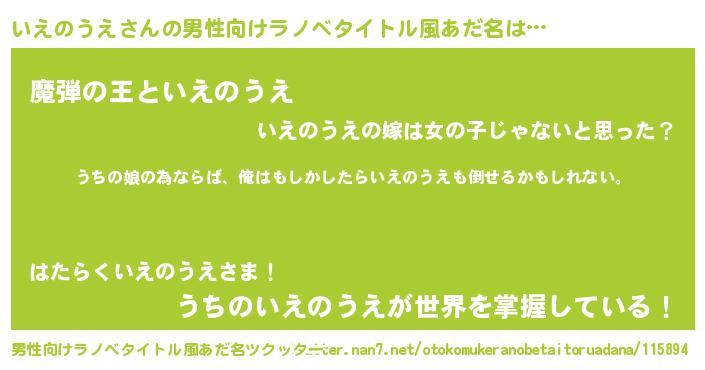 | 女子向けラノベタイトル風あだ名 | 『いえのうえ伯爵の花嫁』 |