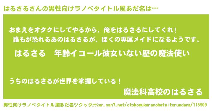 | 女子向けラノベタイトル風あだ名 | 『はるさるの玉の輿計画!』 |