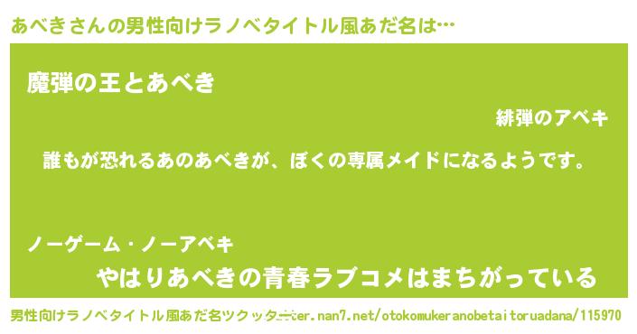 | 女子向けラノベタイトル風あだ名 | 『異世界でカフェあべきを開店しました。』 |