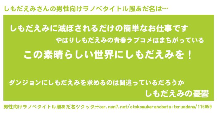 | 意味不明あだ名 | 『住所不定無職しもだえみ(65歳)』 |