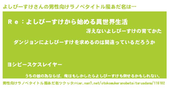 | 女子向けラノベタイトル風あだ名 | 『よしぴーすけは平凡を望む』 |