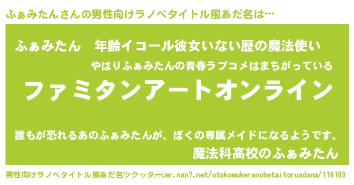 | 意味不明あだ名 | 『ペロリンふぁみたん』『自称ふぁみたん』 |