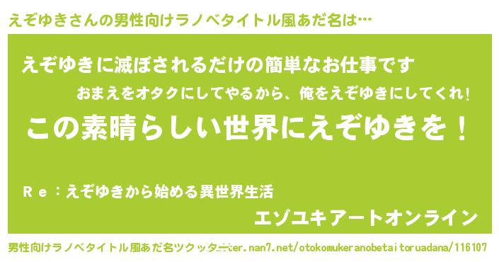 | 女子向けラノベタイトル風あだ名 | 『悪役えぞゆきに転生したようですが、知った事ではありません』 |