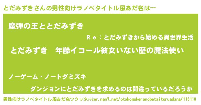 | 女子向けラノベタイトル風あだ名 | 『とだみずきの玉の輿計画!』 |