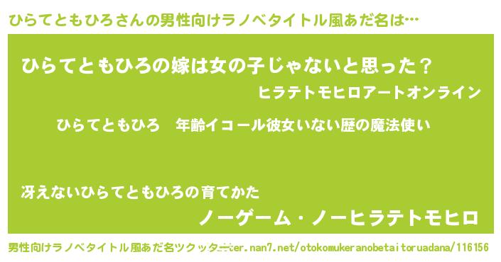 | 女子向けラノベタイトル風あだ名 | 『ひらてともひろの玉の輿計画!』 |